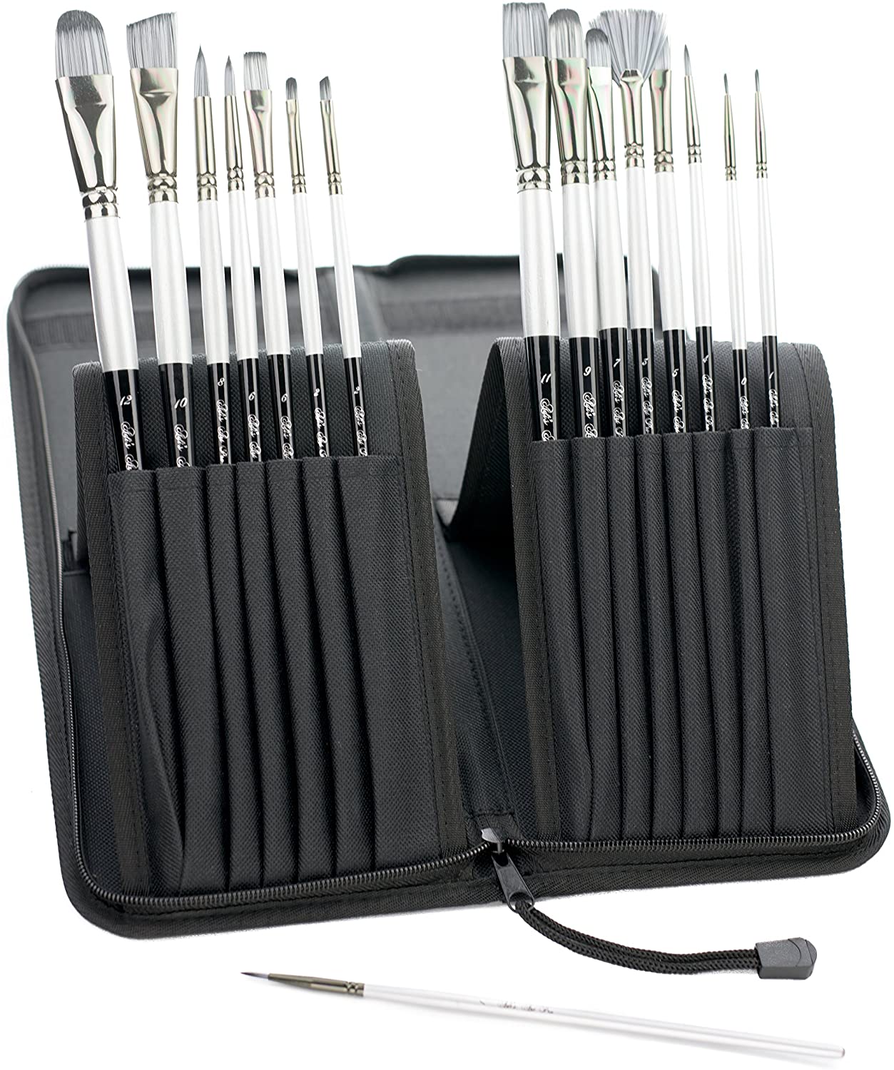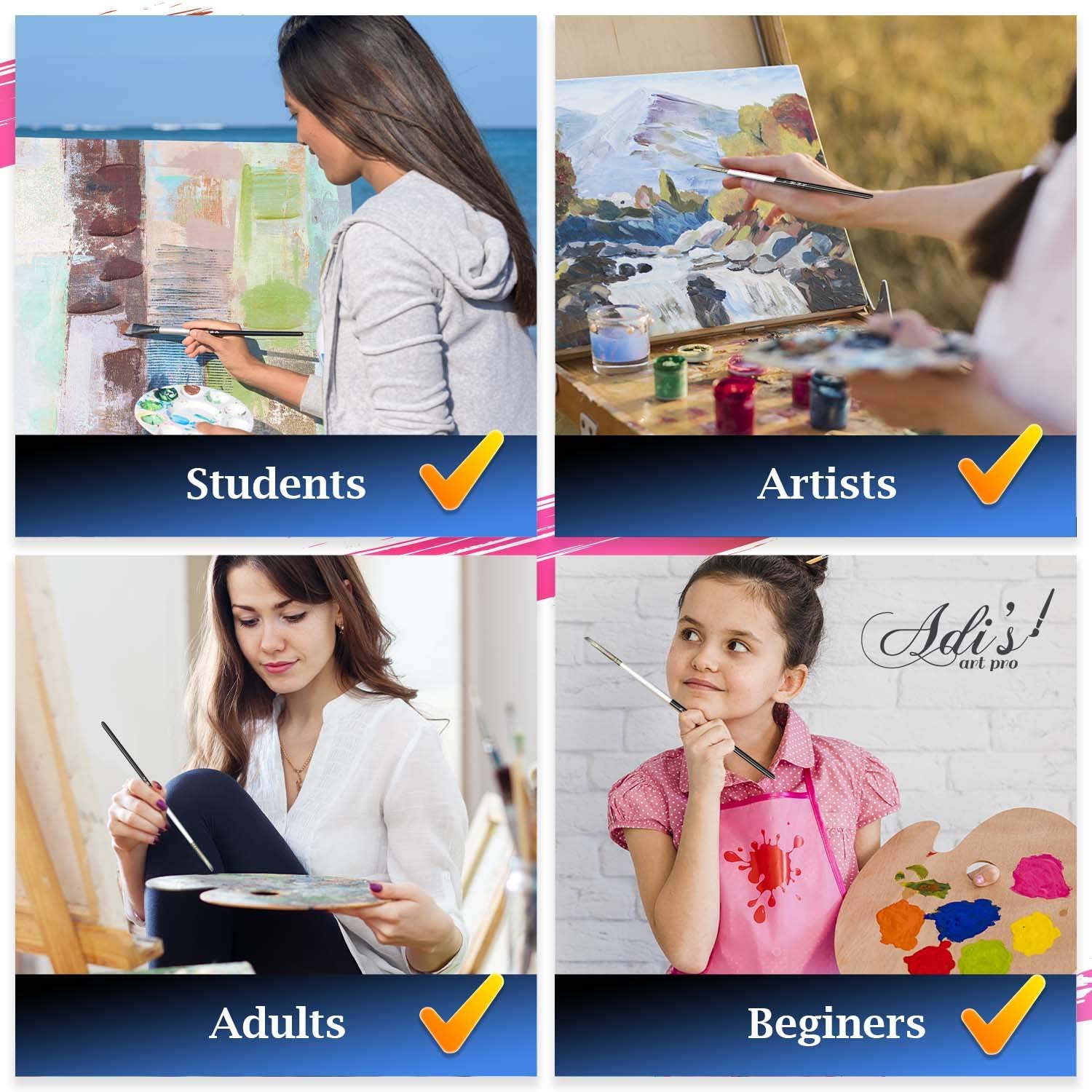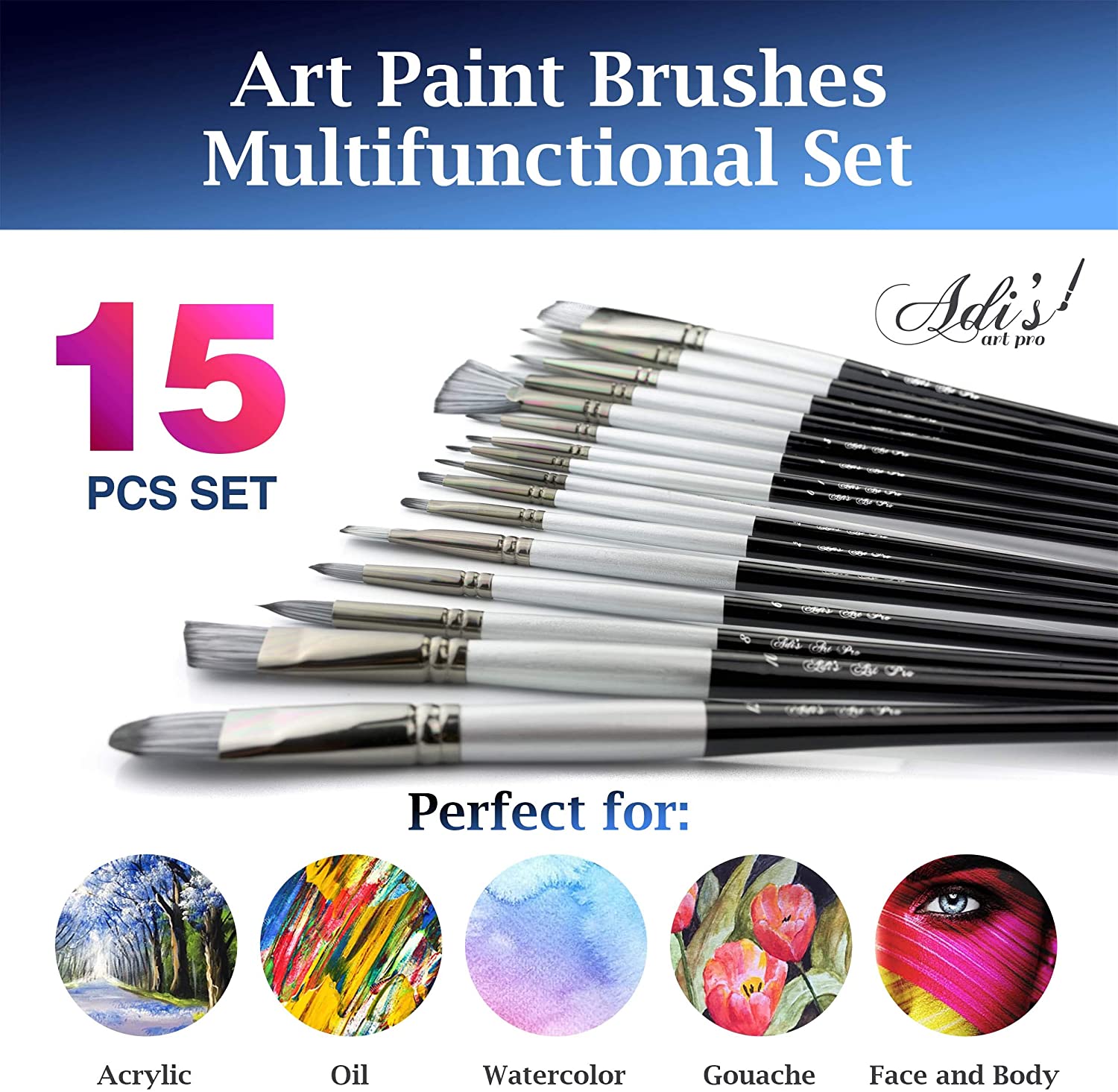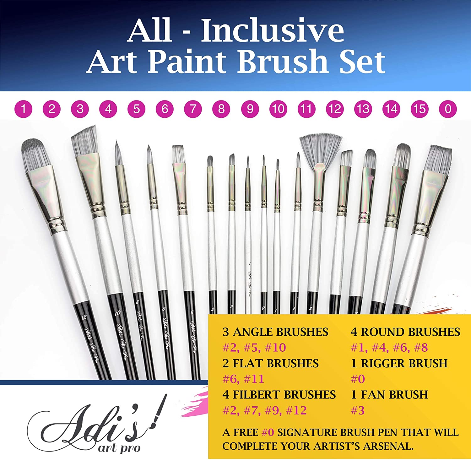 🖌 EXHAUSTIVE PAINT BRUSH SET: Adi’s art pro 15-piece art paint brushes set comes with (3) angle brushes, (2) flat paint brush sizes, (4) filbert paint brushes, (4) round paintbrush sizes, (1) rigger brush, and (3) fan brushes. We’ve also included a free signature brush pen to give you a greater bang for your buck.